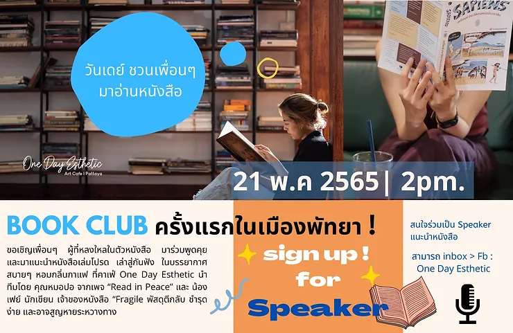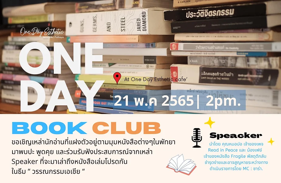 One Day Book Club ครั้งที่ 1 นี้จัดขึ้นเพื่อรวมตัว คนรักหนังสือ ที่แอบแฝงตัวอยู่ตามมุมหนังสือต่างๆ ในพัทยา ขอเชิญมาร่วมพบปะ พูดคุย แลกเปลี่ยนประสบการณ์ สุนทรียะจากหน้าหนังสือเล่มโปรด ในบรรยากาศสบาย ๆ เคล้ากลิ่นกาแฟ ที่ร้านวันเดย์